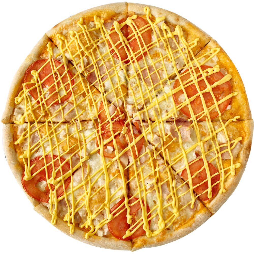 Бекон, курица, помидоры, чесночный соус, сыр Моцарелла, сырный топпинг, орегано