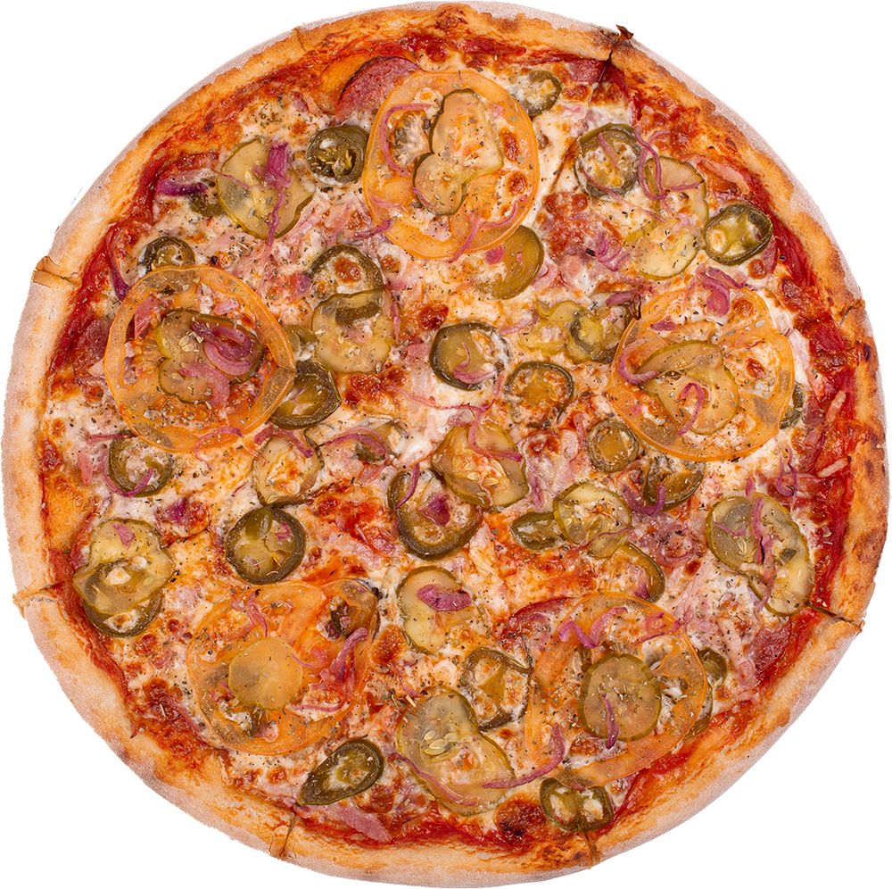 Салями, бекон, помидоры, огурец маринованный, лук маринованный, перец халапеньо маринованный, сыр моцарелла, фирменный соус для пиццы, орегано