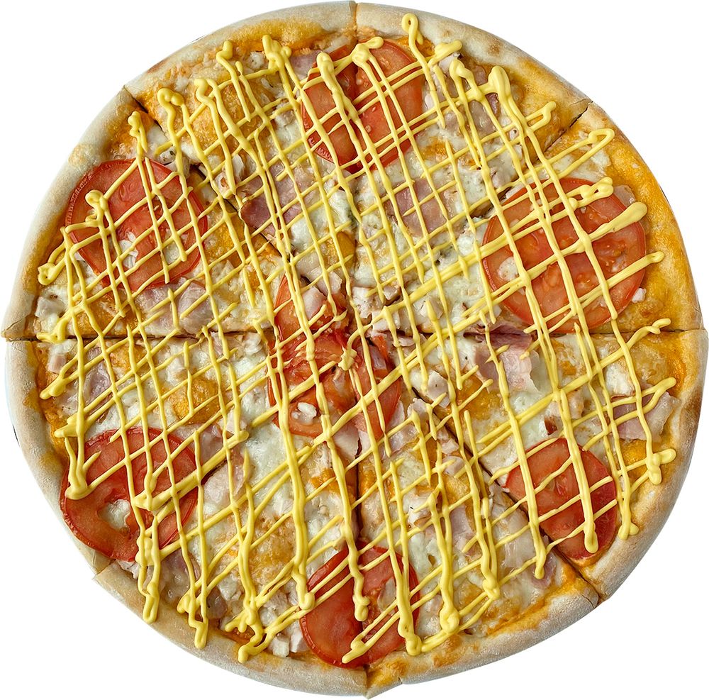 Бекон, курица, помидоры, чесночный соус, сыр Моцарелла, сырный топпинг, орегано