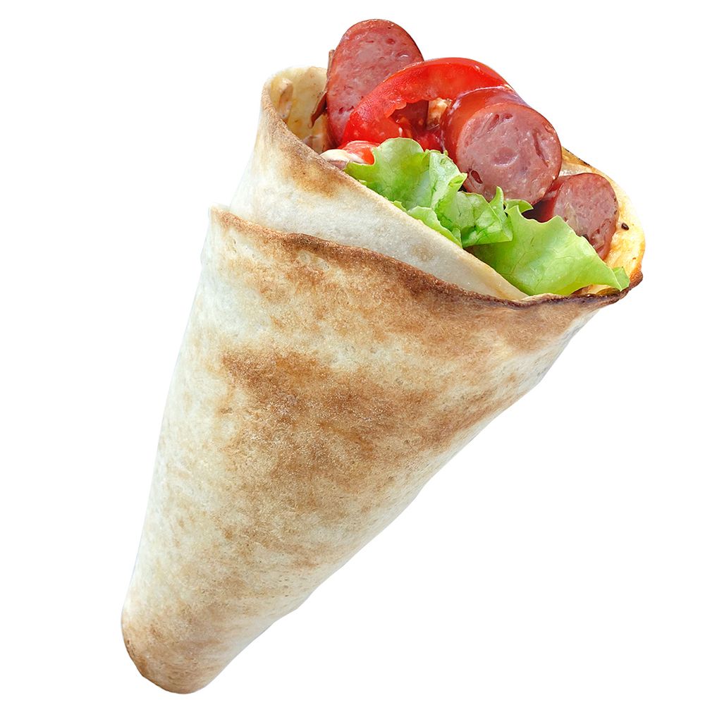 охотничьи колбаски, шампиньоны, томаты, листья салата или пекинская капуста (по сезону), сыр моцарелла, фокачча, соус ранч