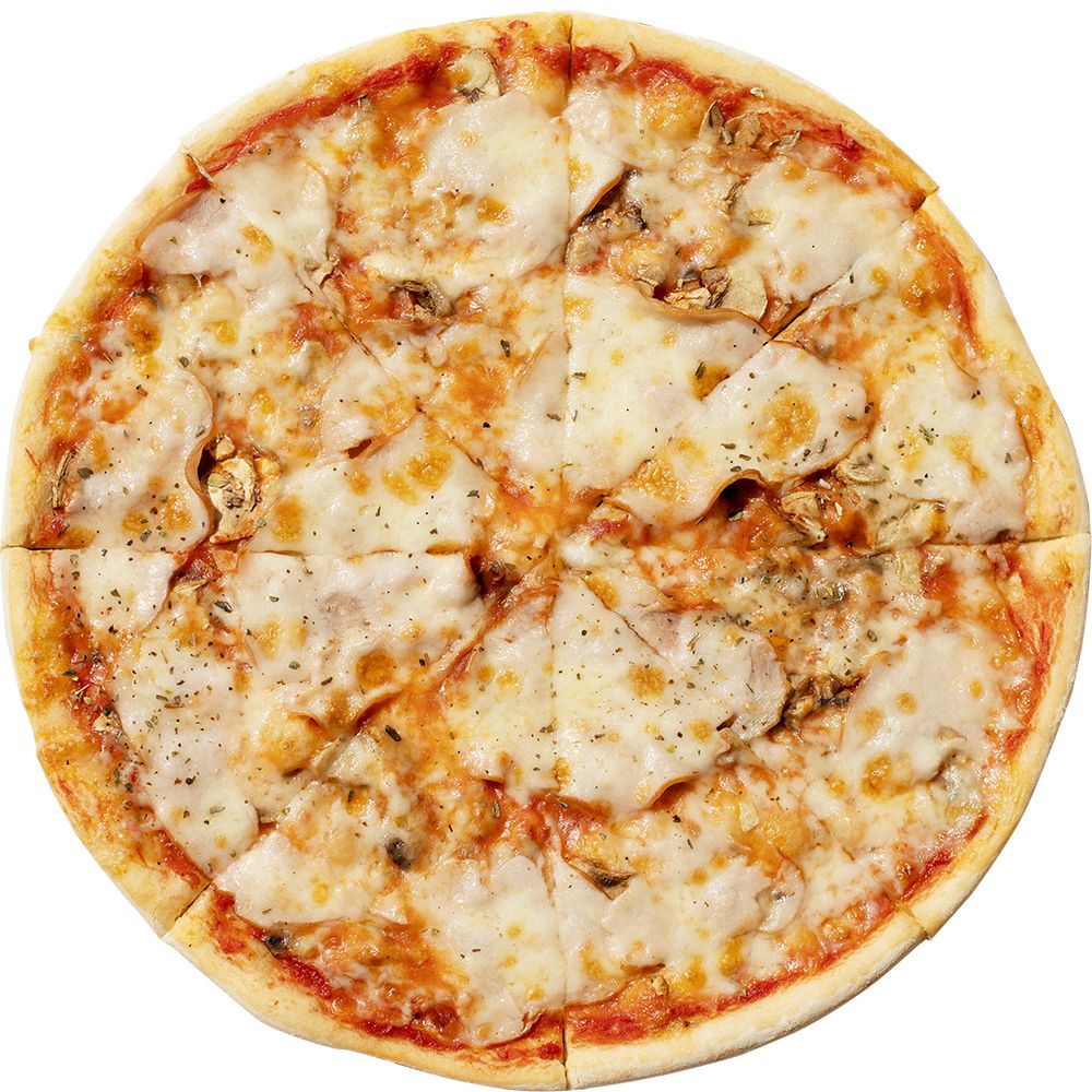 ветчина, шампиньоны, сыр моцарелла, фирменный соус, орегано