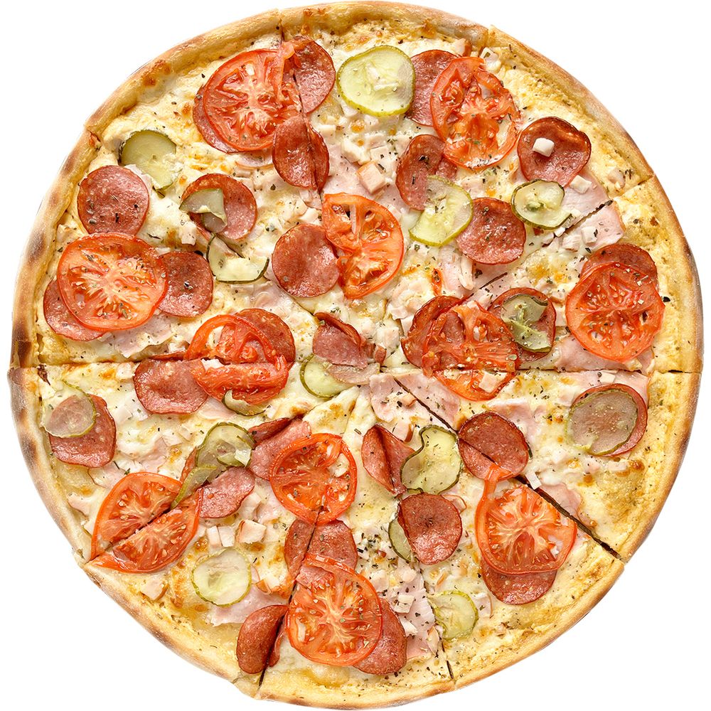 ветчина, курица, салями, томаты, огурцы консервированные, соус ранч, сыр моцарелла, орегано
