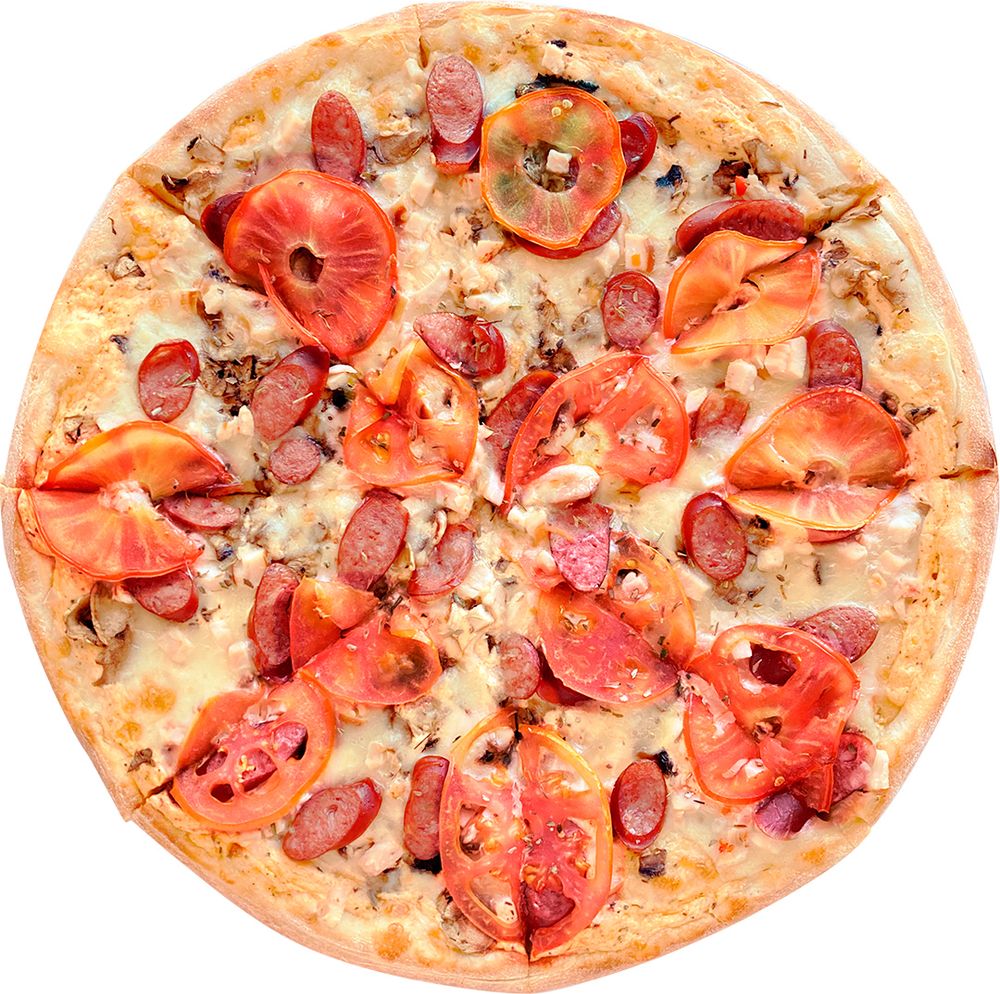 охотничьи колбаски, курица, шампиньоны, томаты, сыр моцарелла, соус ранч, орегано