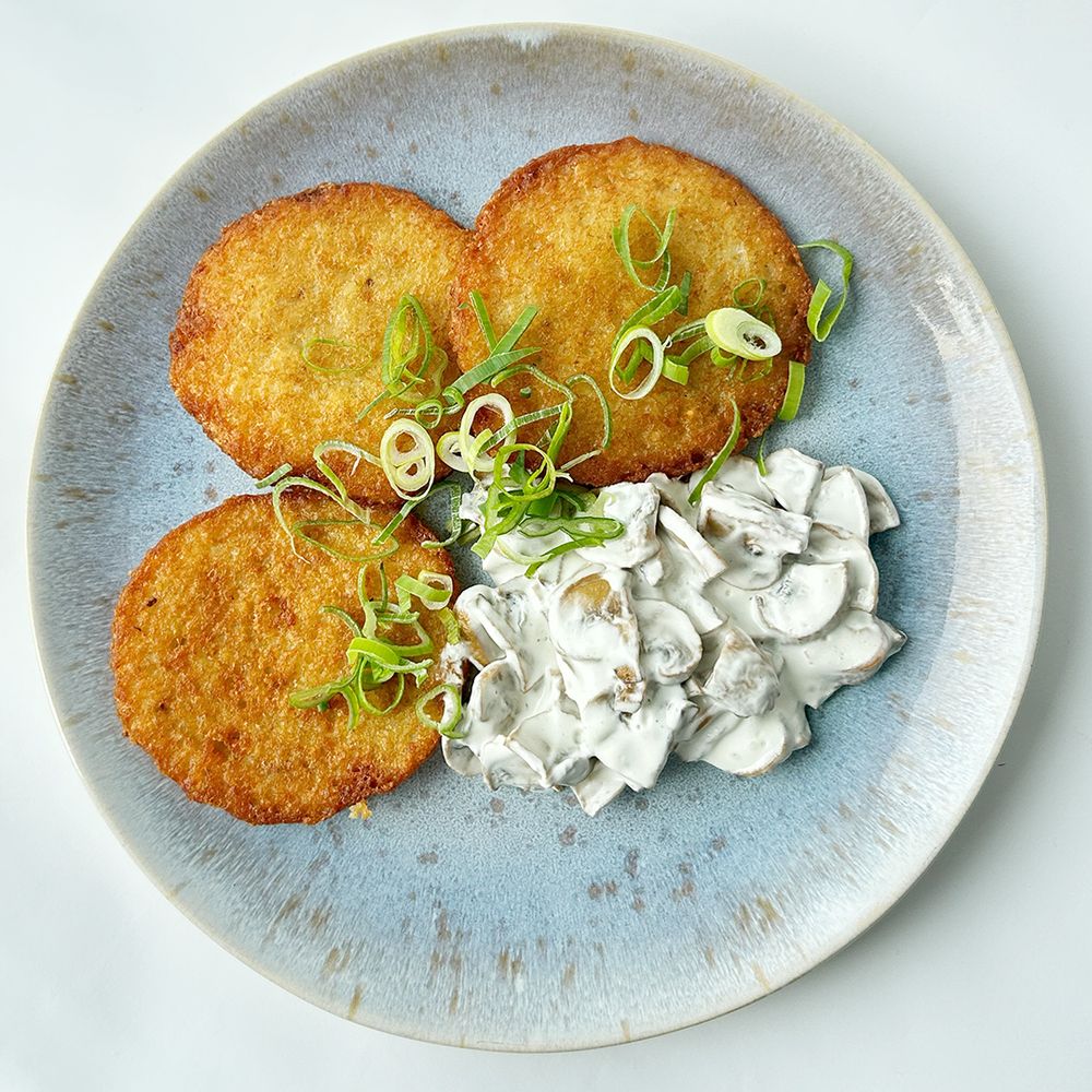 Драники (картофель, лук репчатый), Шампиньоны, Сметана, Лук зеленый