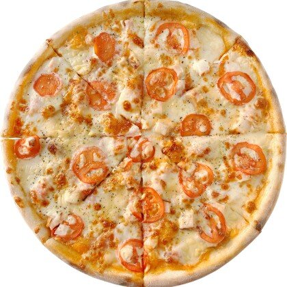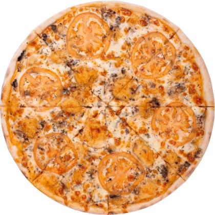 Тесто, Соус фирменный, Ветчина, Курица, Сыр Моцарелла, Сыр сливочный, Орегано