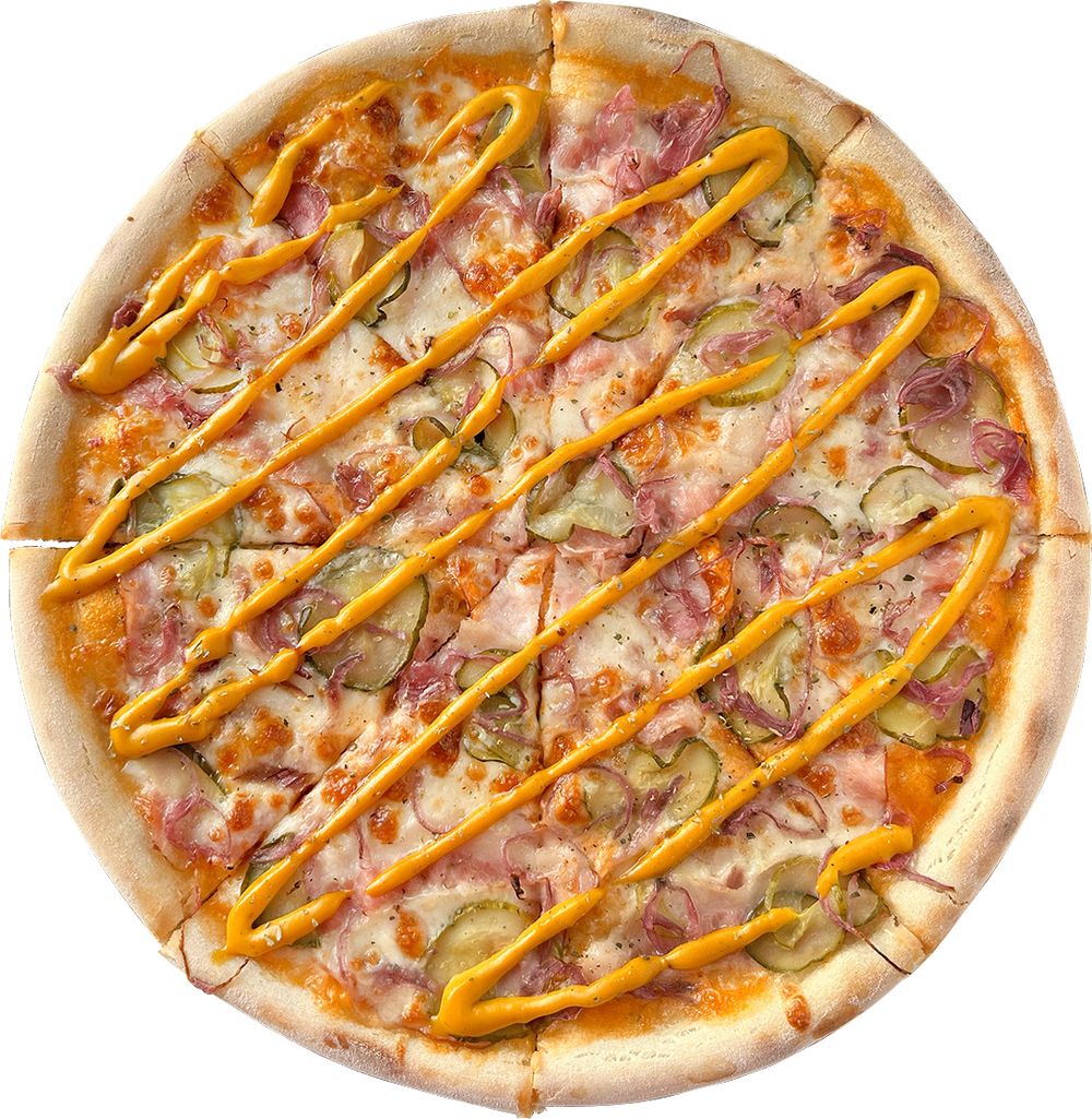 Тесто, Соус чесночный, Ветчина, Сыр Моцарелла, Бекон, Лук маринованный, Огурец консервированный, Соус "Горчичный", Орегано