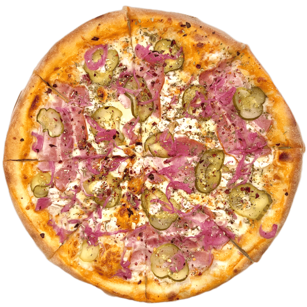 Соус чесночный, Сыр Моцарелла, Бекон, Курица, Огурец консервированный, Лук маринованный, Чили, Орегано