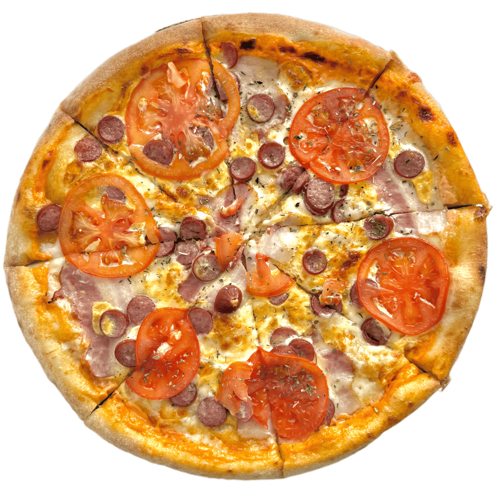 Соус чесночный, Сыр Моцарелла, Колбаски охотничьи, Бекон, Яйцо, Томаты, Орегано