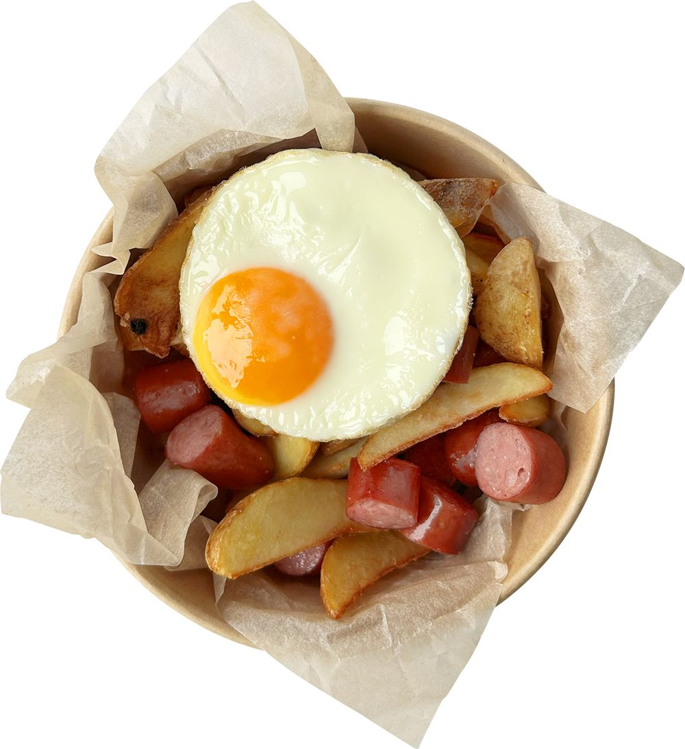 Картофельные дольки, колбаски, яйцо, соус на выбор