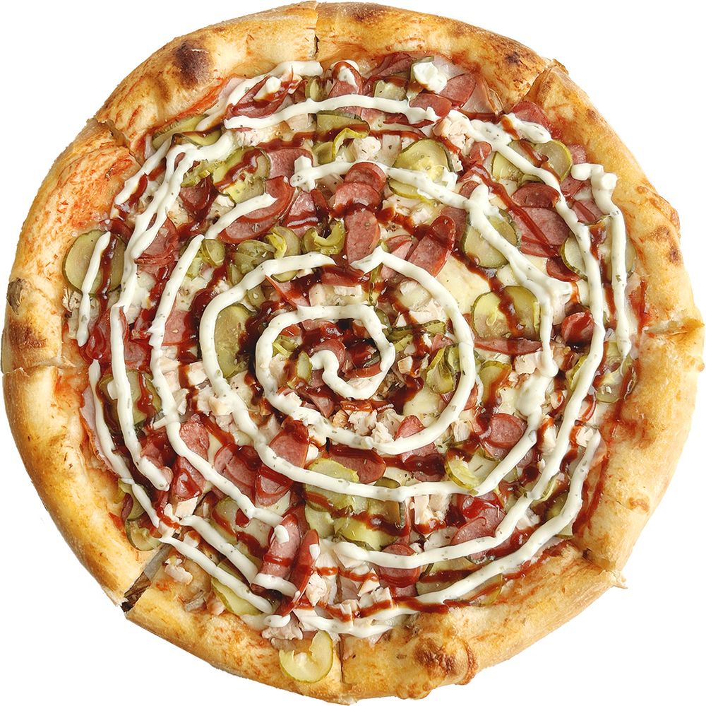 Соус фирменный, шампиньоны, ветчина, сыр Моцарелла, курица, колбаски охотничьи, огурцы консервированные, соус "Тартар", Соус "Барбекю", орегано