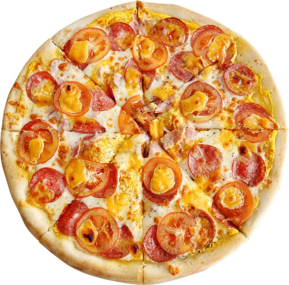 Соус "Сырный" , Ветчина, Сыр Моцарелла, Салями, Помидоры , Сыр Чеддер, Орегано
