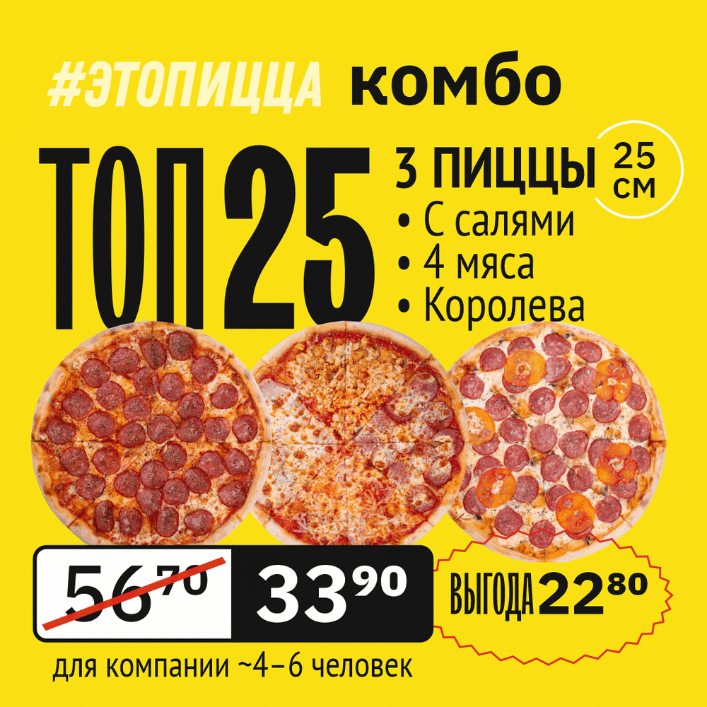 3 пиццы 25 см: С салями, 4 мяса, Королева