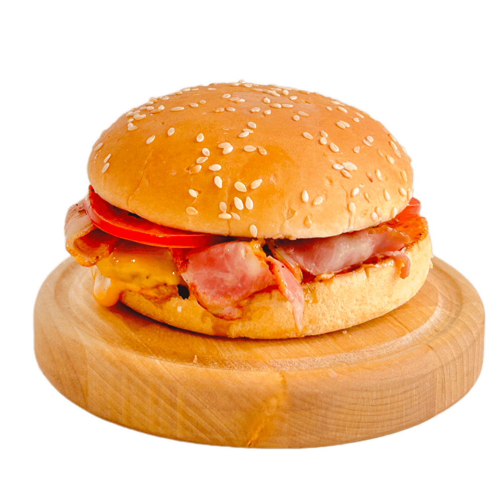 говяжья котлета, бекон, томаты, маринованный лук, салат айсберг, сыр чеддер, соус для бургеров