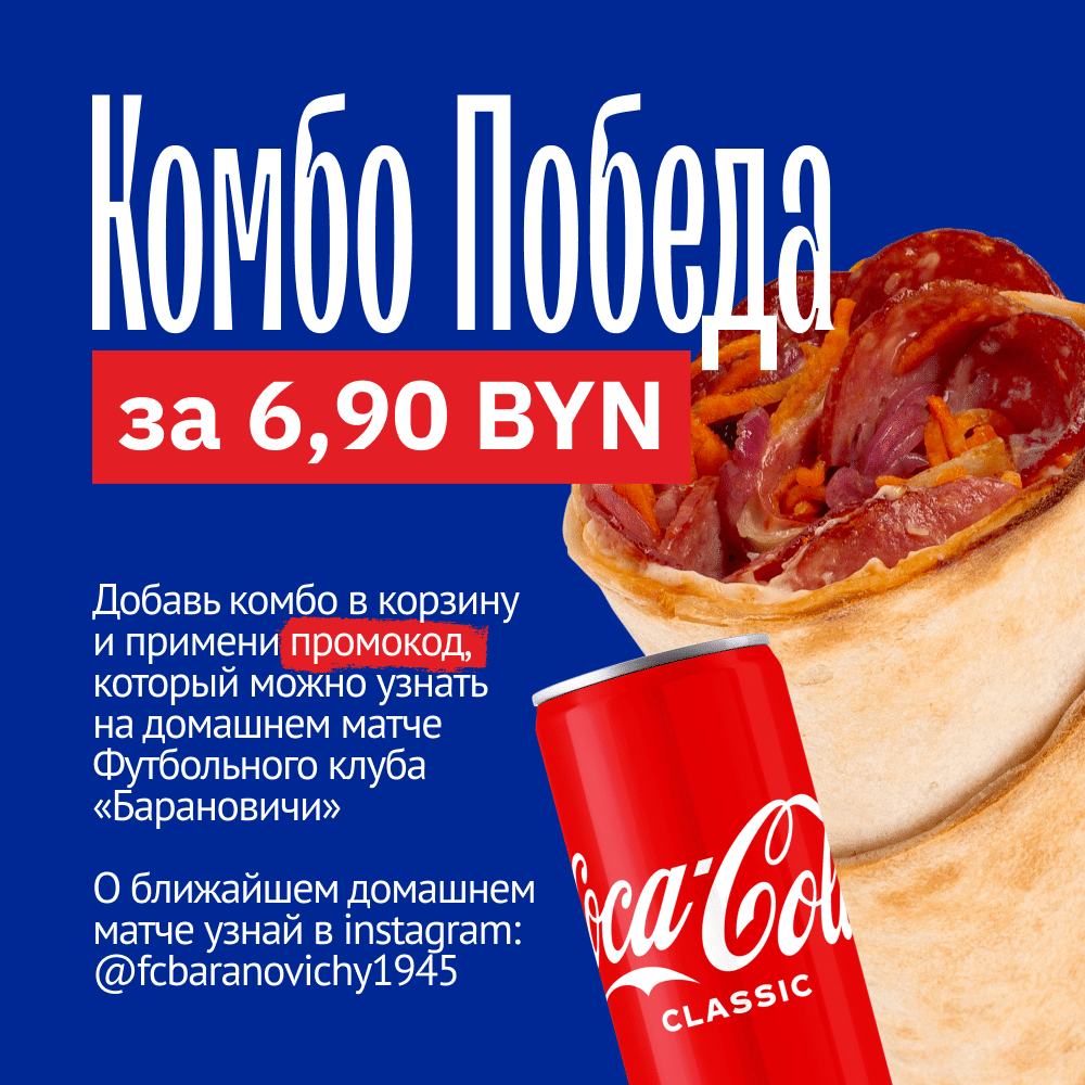 Ролл Ракета средний+напиток 0,33 на выбор. Чтобы получить это Комбо за 6,90, необходимо в корзине ввести промокод, который можно узнать на домашних матчах футбольного клуба Барановичей.